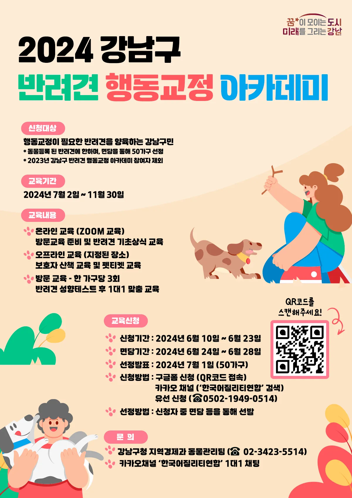안녕하세요! 멍멍마인드입니다. 반려견을 사랑하는 여러분! 오늘은 강남구에서 진행하는 멋진 프로그램, 2024년 반려견 행동교정 아카데미에 대해 소개해 드리려고 합니다. 반려견의 문제 행동으로 고민하고 계신다면, 이번 기회를 놓치지 마세요! 😍 댕댕이와 반려동물을 사랑하는 멍멍마인드!