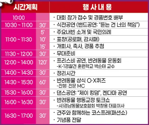 이번 축제에는 다양한 프로그램들이 준비되어 있어요. 식전 공연으로 활기차게 시작하며, 반려동물과 함께 즐길 수 있는 여러 활동들도 마련되어 있답니다. 🎉