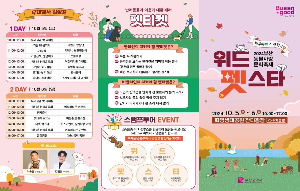 행사는 이틀간 열리며, 화명생태공원의 잔디광장에서 다양한 프로그램이 진행될 예정이에요. 반려인뿐만 아니라 예비 반려인도 함께 즐길 수 있는 축제가 될 거예요.
